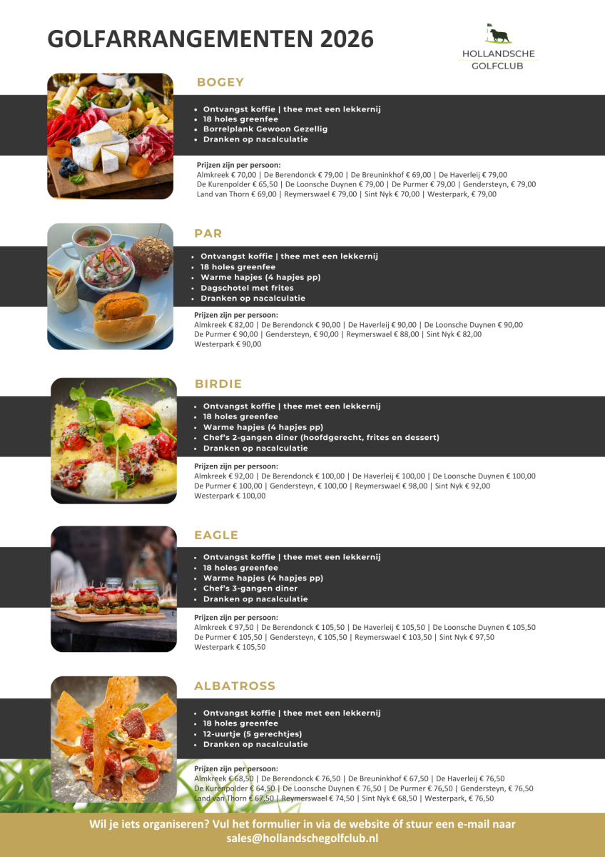 - Golfarrangementen zijn een groepsboeking met een minimum van 9 deelnemers.