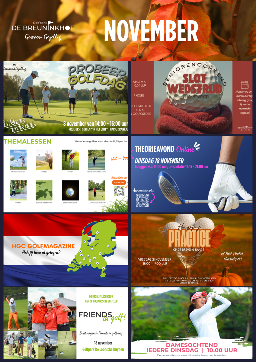 Binnen dit gedeelte van de website word je op de hoogte gehouden van events en andere belangrijke data op Golfpark De Breuninkhof. Zie ook de activiteiten in het menu links.Op De Breuninkhof worden activiteiten en wedstrijden georganiseerd door de Hollandsche Golfclub: voor iedereen, of je nu lid bent van onze club of niet. Heel soms zijn activiteiten alleen voor Golfstarters; dit zijn beginners uit ons opleidingstraject. Tijdens deze activiteiten leer je op een ongedwongen, gezellige manier het golfspel, in kleine groepjes met volledige aandacht van de pro.